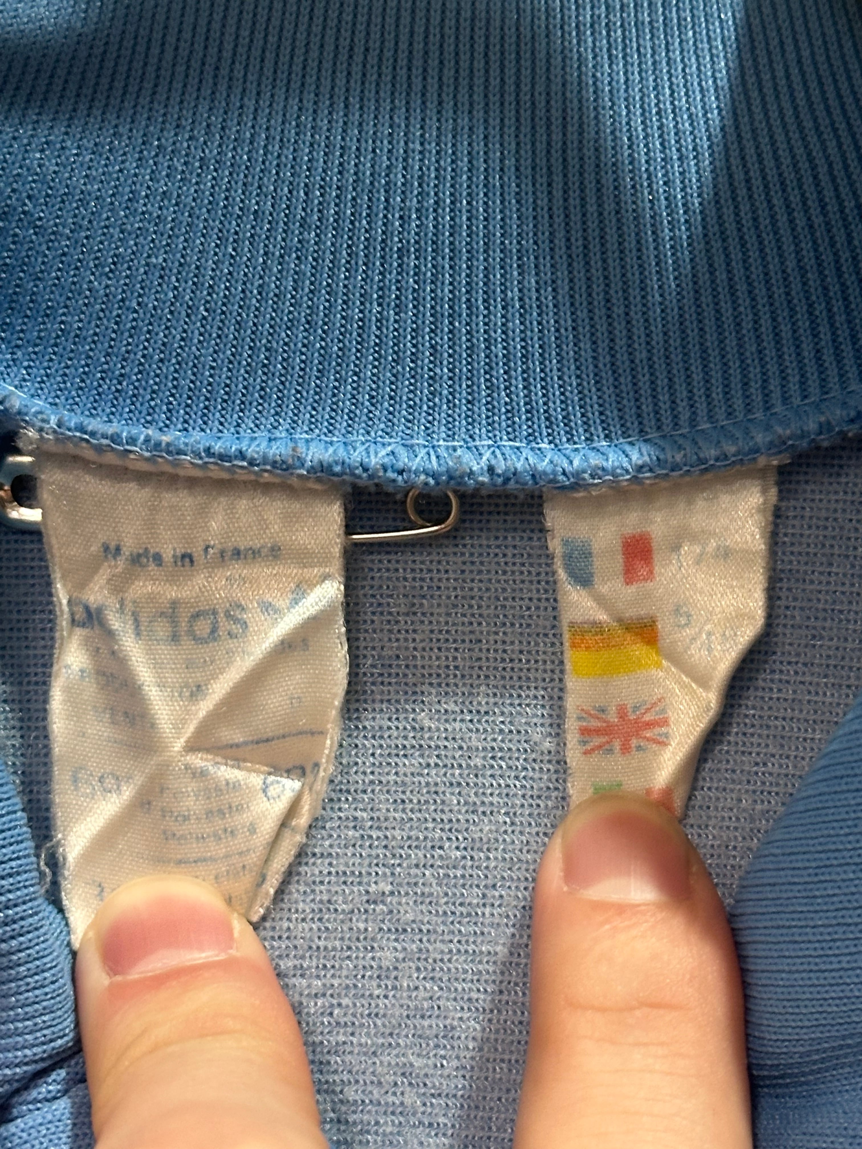 水色を基調として、フランスの国旗にもあるカラーを採用して配色されていて見た目からもフランス感が伝わるトラックジャケット。